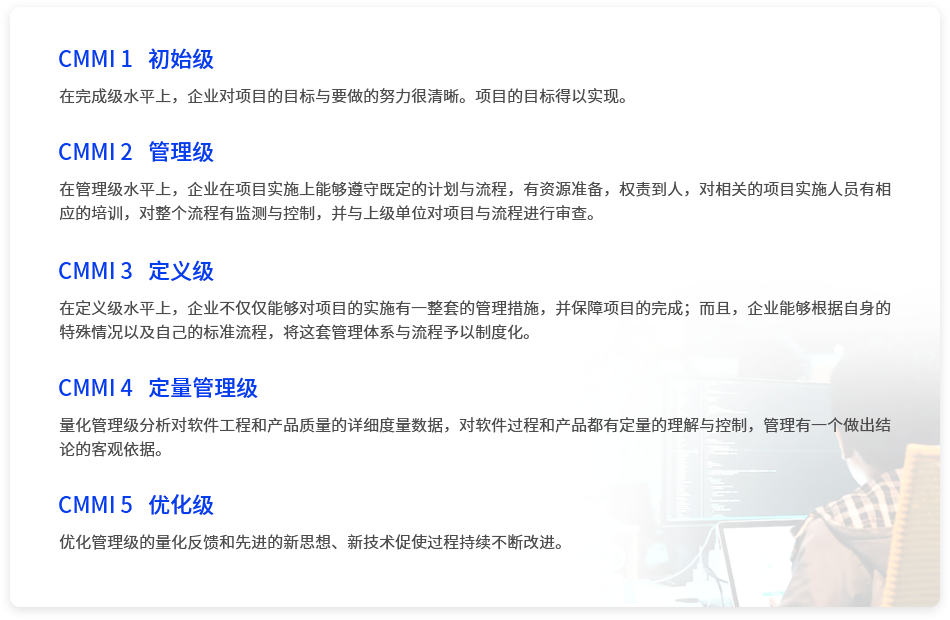 CMMI共有5个级别,级别越高,成熟度越高。高成熟度等级表示有比较强的软件综合开发能力。